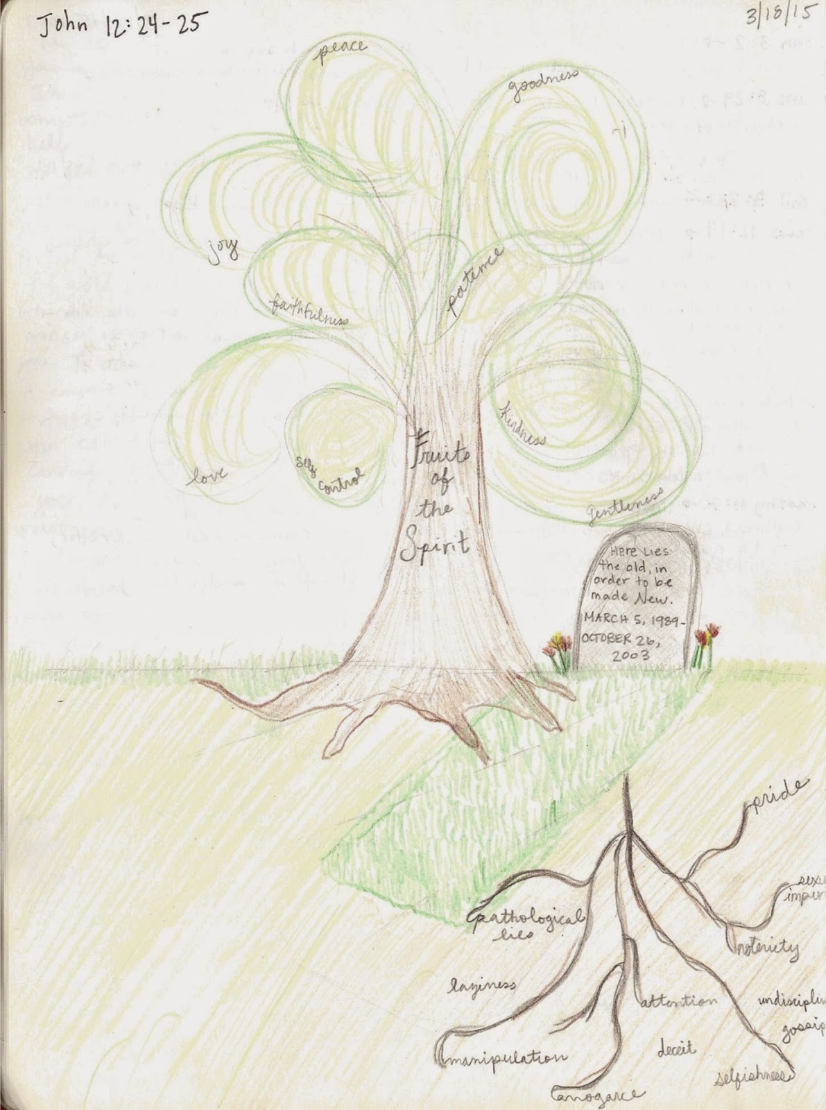 – Here I was trying to explore the parts of me, my sinful nature, that have to continually die in order for the fruits of the spirit to grow. The putting to death of these things began the day I decided to make Jesus Lord, and they are things I must put to death every day. This idea is captured in the writing on the tombstone: “Here lies the old. in order to be made new.”