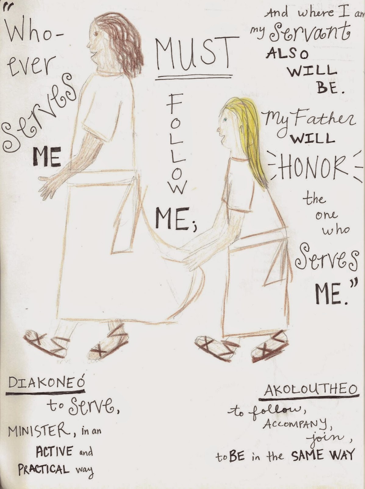 – I believe Jesus has taken the concept of serving to another level. Many of us understand what it takes to serve someone: make them dinner, clean their house, babysit their kids for free, etc. Jesus is saying that in order to truly serve Him it’s not just with actions but a way of life. Following him so closely that you fall into step with him. That his dust is kicked up and covers your feet. As the greek says, “to be in the same way”. Not out of obligation or duty, but out of a longing and a desire to follow Jesus, to be His disciple.